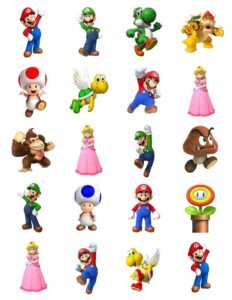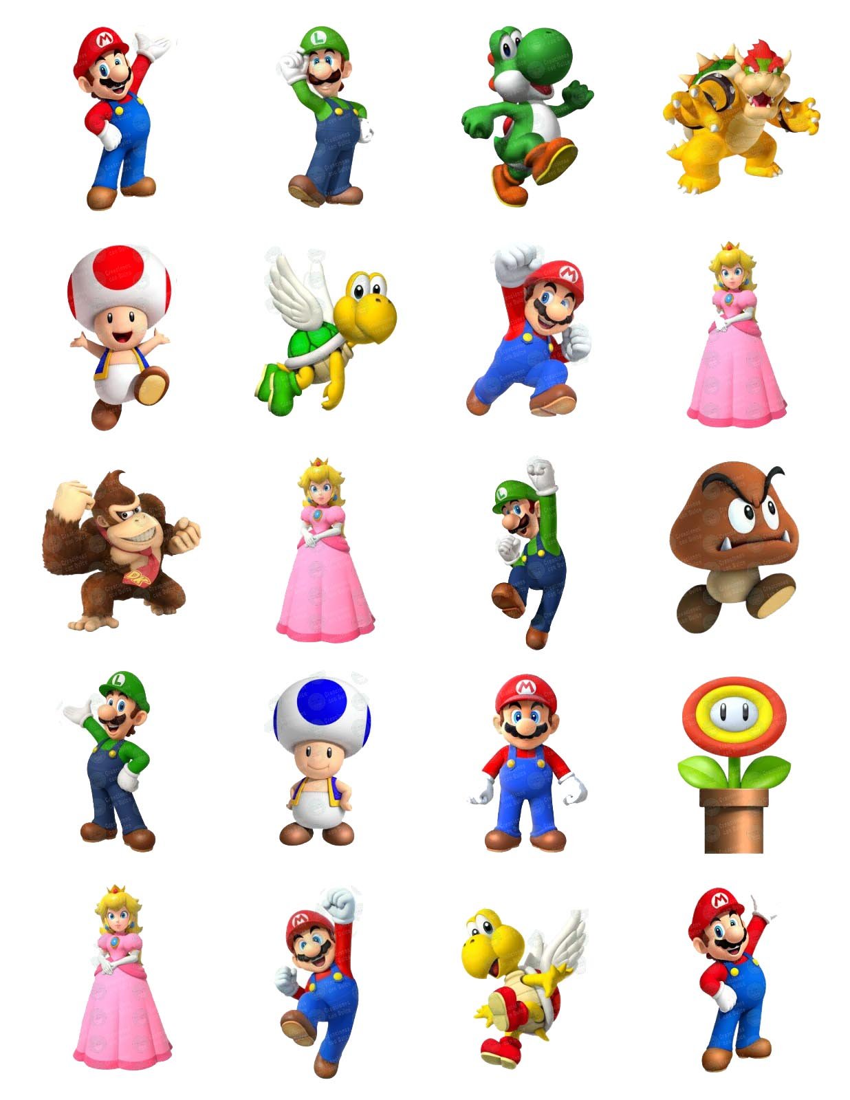Tema Mario Bros con 17 diseños diferentes que se repiten en las cinco hojas.