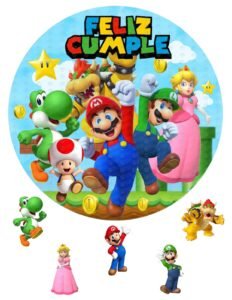 Descripción del transfer para gelatina de Mario Bros pack de 5 hojas con 86 círculos